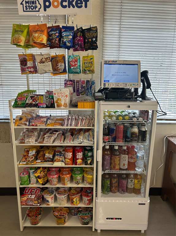 その名も「ミニストップポケット」。工場2F食堂に設置され、キャッシュレス決済専用でドリンクやお菓子、軽食を購入できます。