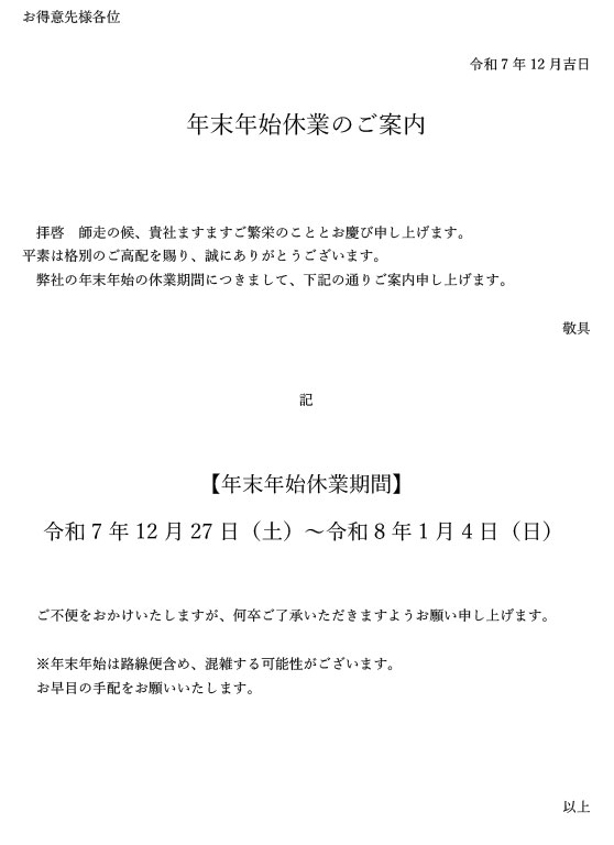 年末年始休業のご案内